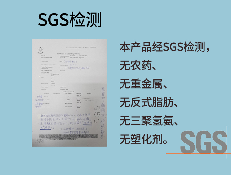 經SGS檢測,無農藥、無重金屬、無反式脂肪、無三聚氫胺、無塑化劑